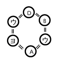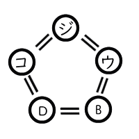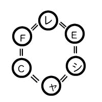 | ○の中にカタカナ1文字を入れてクルリと一回りに読むと言葉になります。 どこから読み始めるか、どちら周りに読むかはわかりません。 A〜Fに入る文字を順に並べるとなんという言葉になるでしょう? (同じ記号には同じ文字がはいります) |