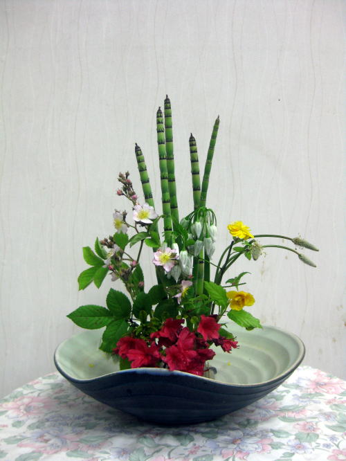 トクサ・ノイバラ・ツリガネスイセン・サツキ とくさ(砥草) トクサ科 ツクシのような胞子を先端につけ、水辺や湿地に自生しています。 竹を小さくしたような風情で庭園の池の周りに植えられています。 ヤスリのような茎と珪酸を含み昔より家具や工芸品の仕上げに使われています。 ちなみに、これで爪を研ぐと爪切りに付いているヤスリなどよりきれいに研げます。 のいばら、全国各地に見られる落葉低木で,日当たりのよい山野に生育しています。 花は初夏に咲き,花びらは白色,まれに淡紅色の花も見られ,芳香があります。 和名は,読んで字のごとく「野に咲くバラ」に由来します つりがねすいせん(釣鐘水仙)ユリ科 別名:シラー スイセンの花とは違い、釣鐘型をしています。 元々は自生種でヨーロッパ及びアフリカ、アジアの温帯地域に分布していました。 さつき ツツジ科ツツジ属 さつきは、5月を示す皐月に由来する名で、これからの時季に花が咲きそろう植物で、50p〜1.5mの低木です。 原産地は日本で、耐寒性・耐暑性ともに強く、5月下旬〜6月上旬にかけて開花します。 |